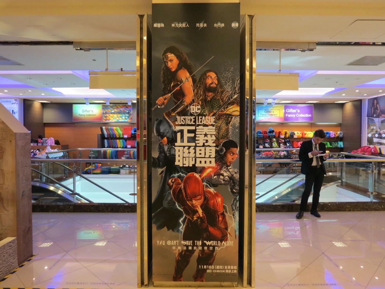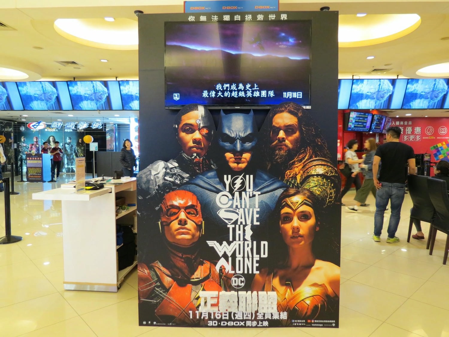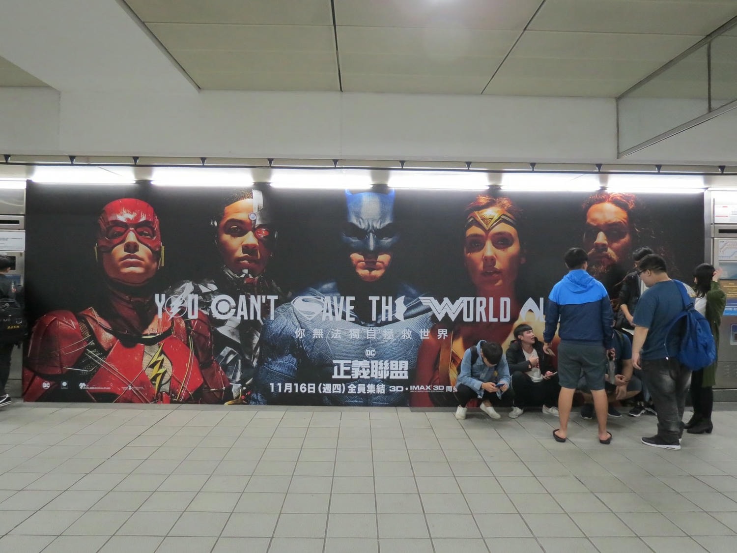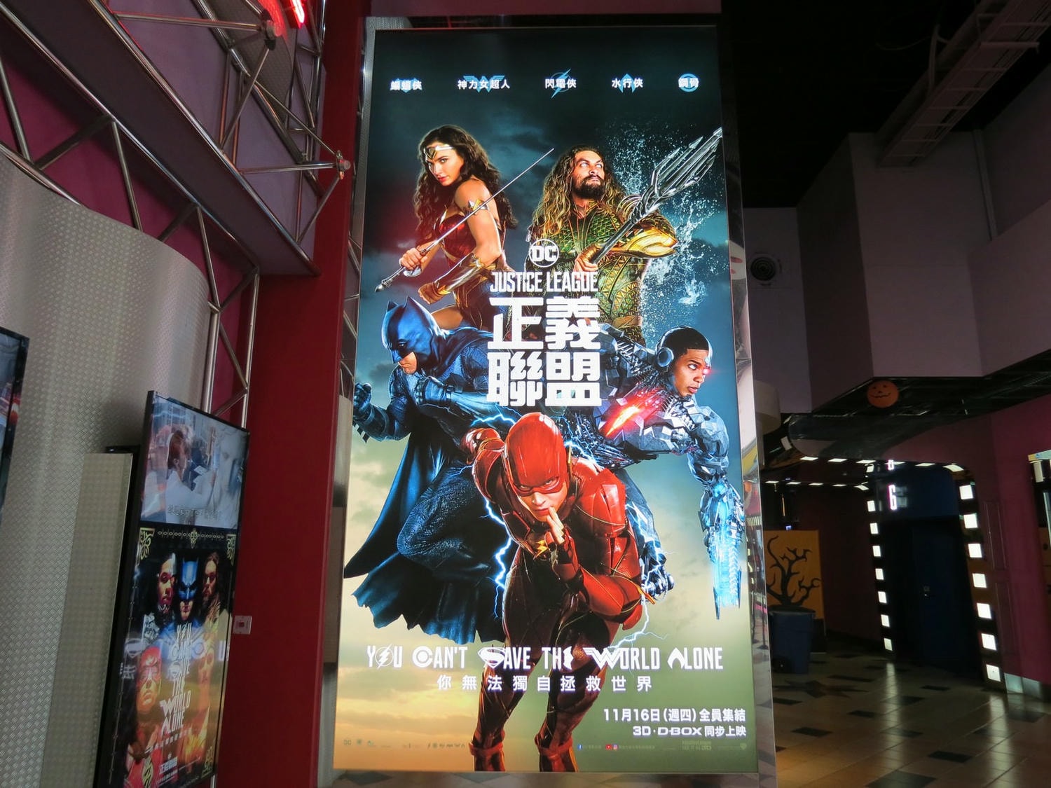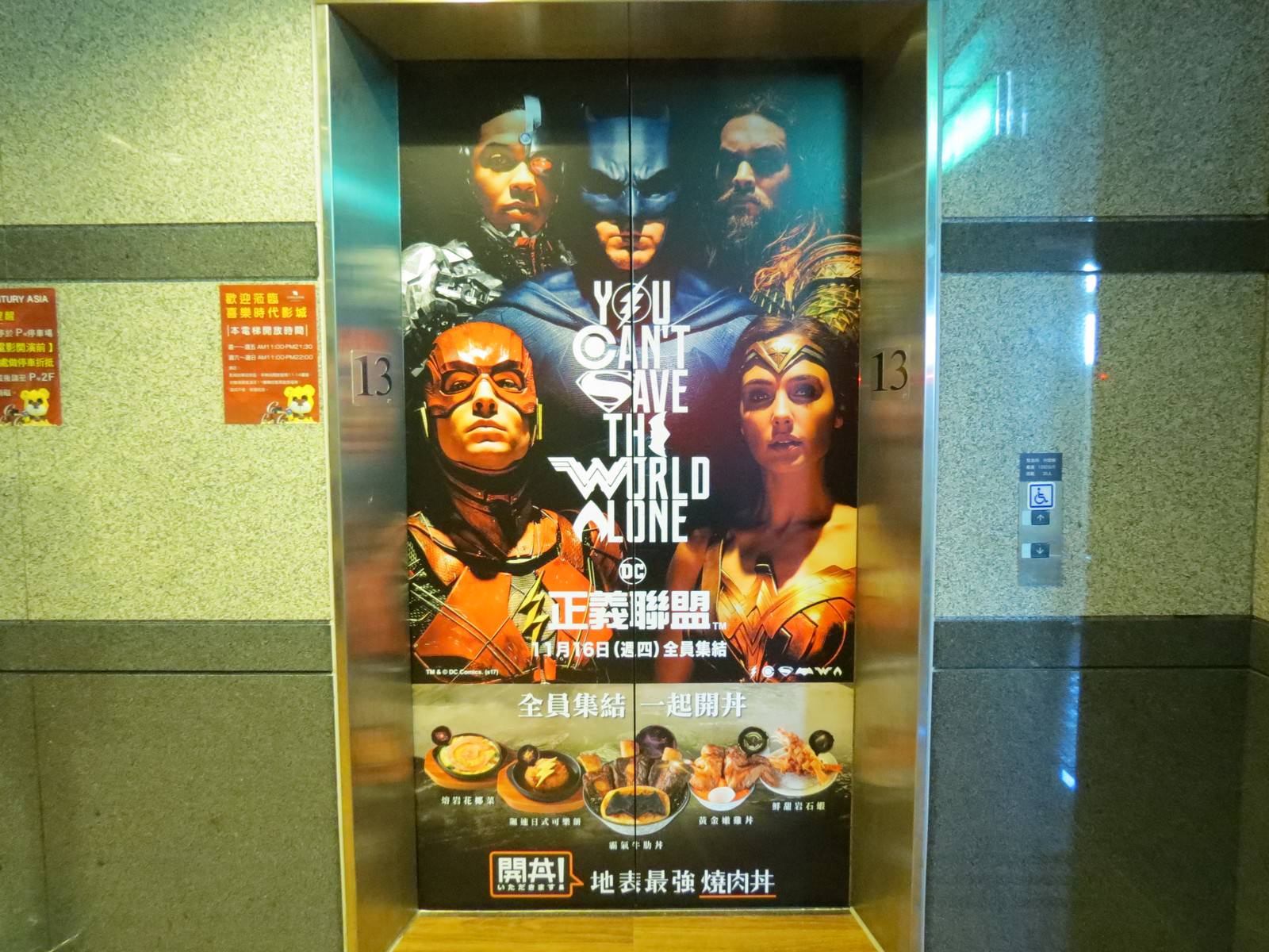 1, 我還蠻喜歡海報上 “You Can’t Save The World Alone” 這句 slogan 包含所有英雄符號的設計,由上而下依序是:閃電俠(O)、鋼骨(C)、超人(S)、蝙蝠俠(E)、神力女超人(W)、水行俠(A)