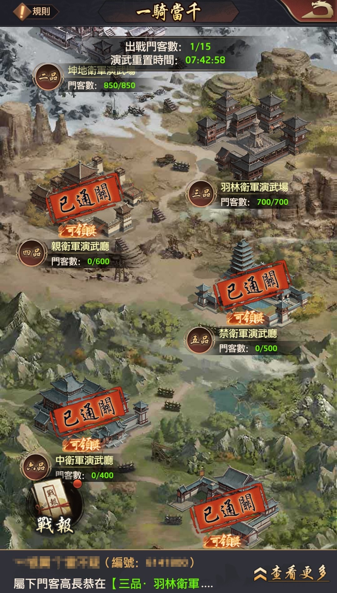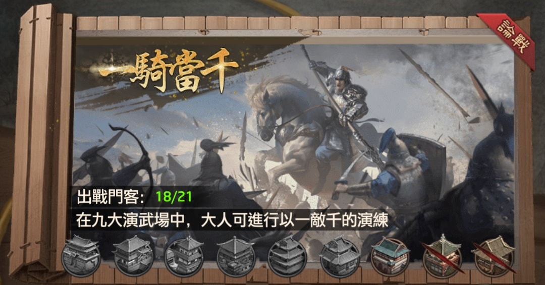 一騎當千共有9個演武場地,需要從九品挑戰起,通關後即可繼續挑戰八品,不斷向上直到門客用光為止。每天凌晨0點0分重置,重置後得從九品關卡挑戰起。