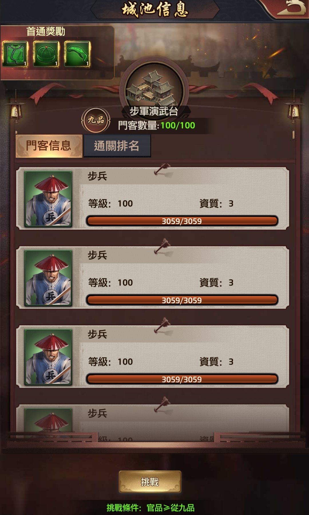 挑戰條件為:門客爵位≥男爵(綠衣),符合條件的門客每日可出戰一次,每天凌晨0點0分後重置。