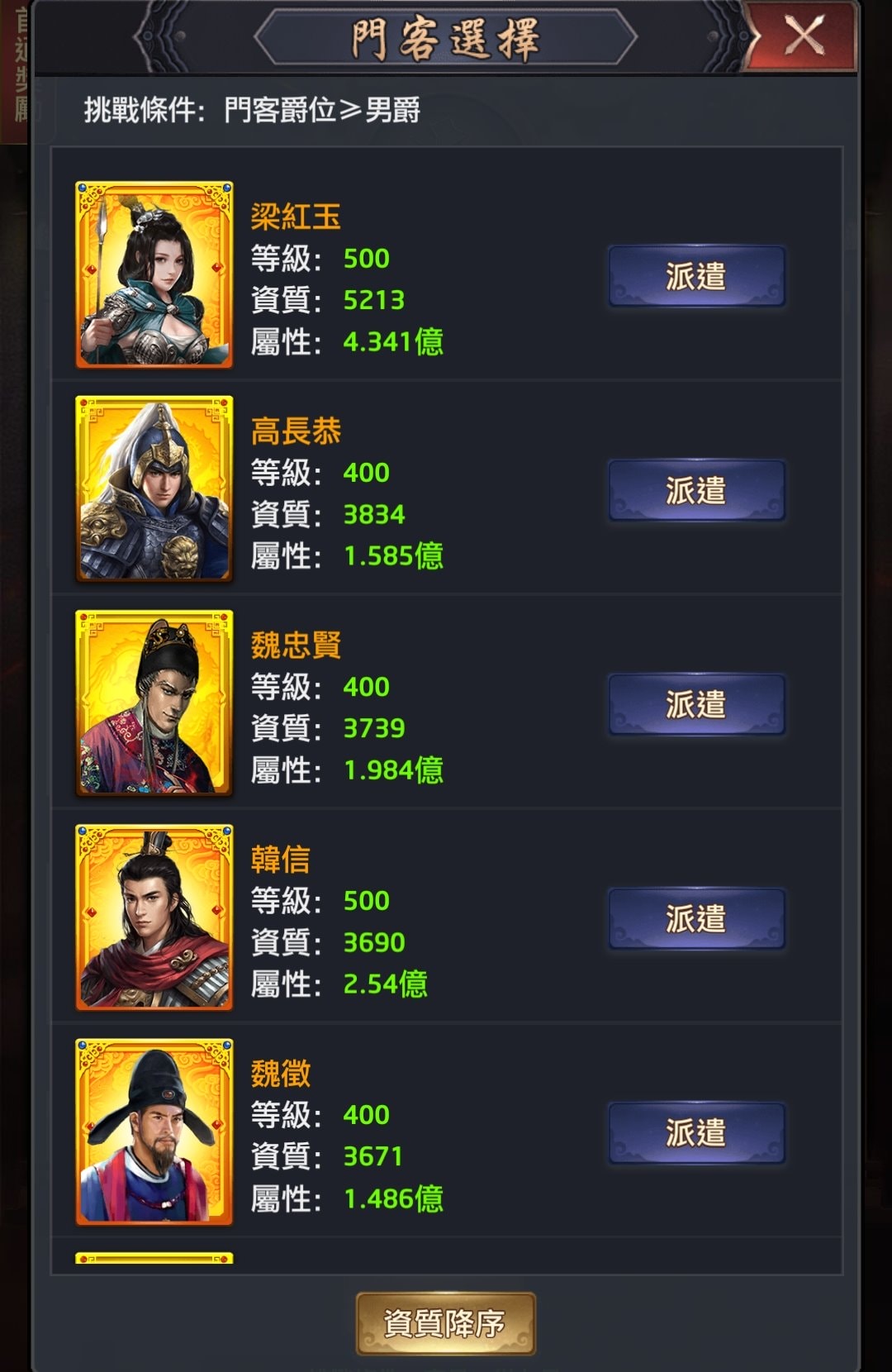 若要用最簡單的方式來每天通關,方法如下:挑戰時按「資質降序」,從資質最低的門客開始派遣出戰,直到門客用光為止,能打幾關就是幾關。