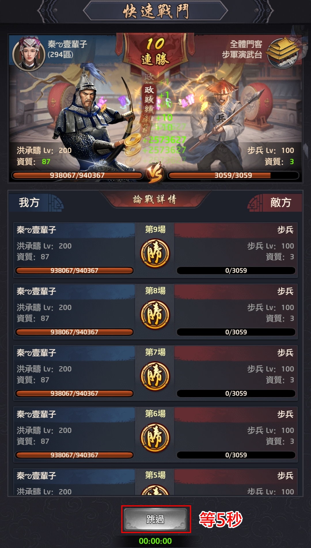 快速戰鬥則是讓系統幫你戰鬥,只要零點幾秒即可計算出雙方對戰(單個門客)後的血量變化,若不想看過程,5秒之後也可以點擊下方「跳過」直接看結果。