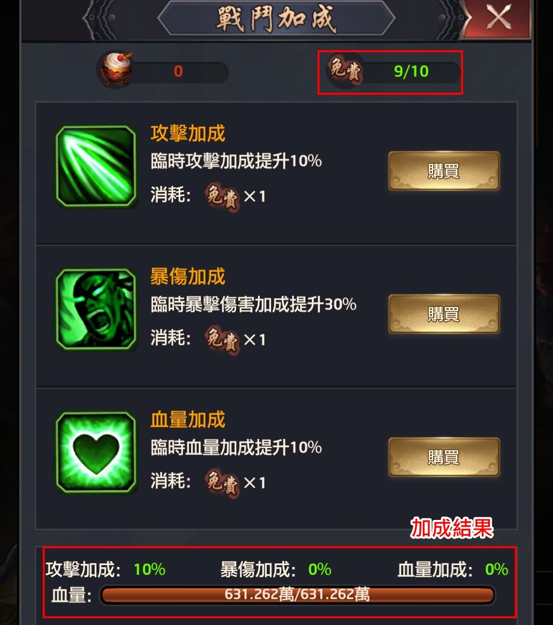 戰鬥加成則是每天可以免費加成10次,每天隨機4次門客(加上出使、挑戰)出戰,共享這10次,要妥善規劃。