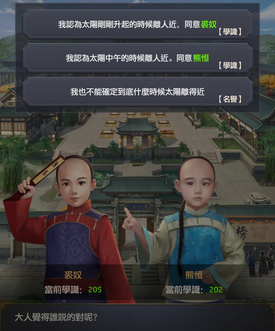 該類事件為兩位學生對事情抱持不同看法,若選學生A,則學生A學識+50;若選學生B,則學生B學識+50。若選不確定,則名譽+30~50。