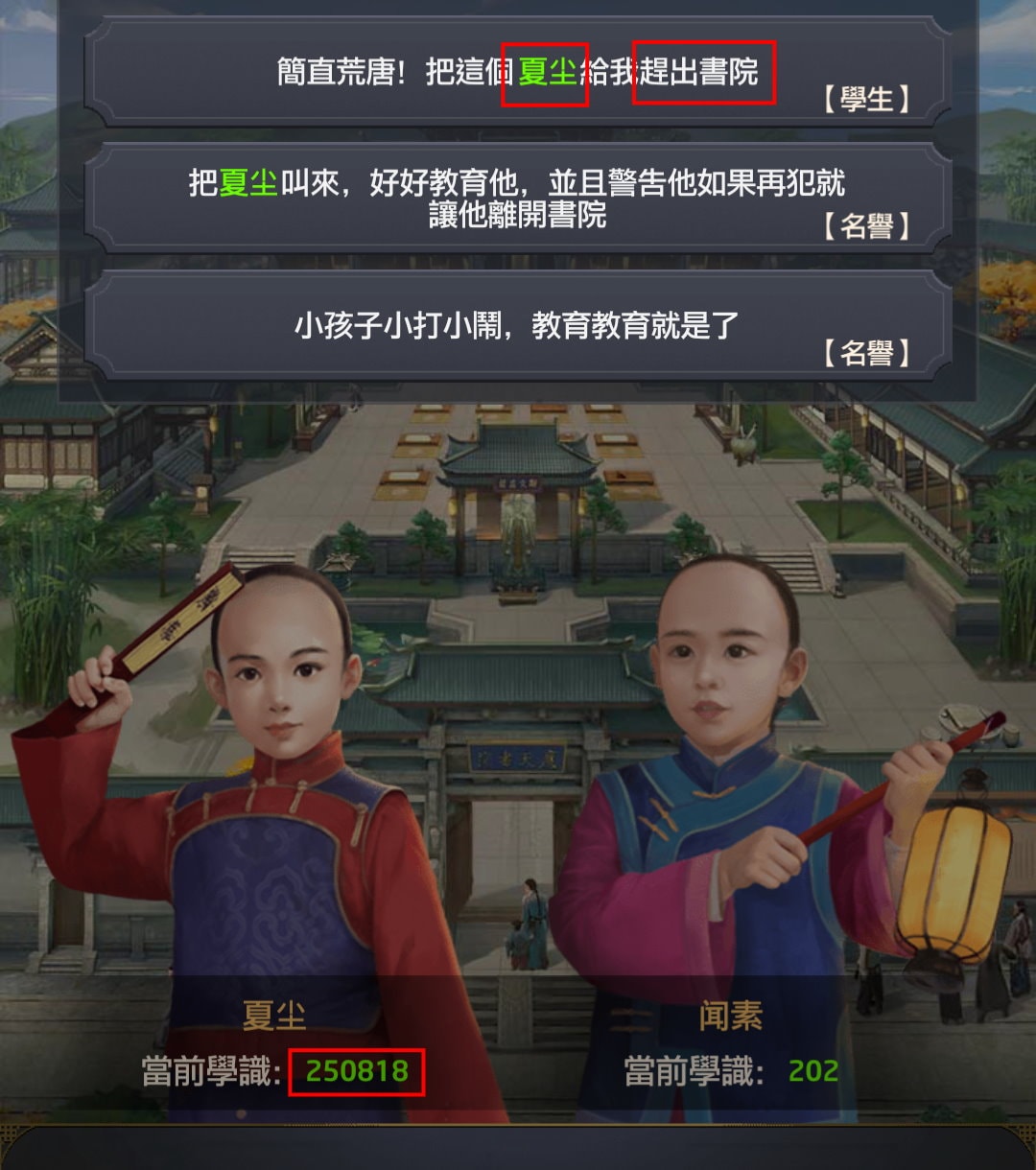 若沒升級過廬舍,只有初始的5名學生,是不會出現這類趕出書院事件的,但只要升級過1次廬舍(10名學生),就開始會出現這類事件。