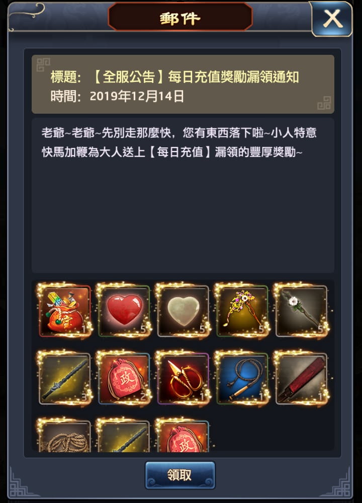 若充值獎勵忘了領取,系統會以「郵件」的方式通知補領。