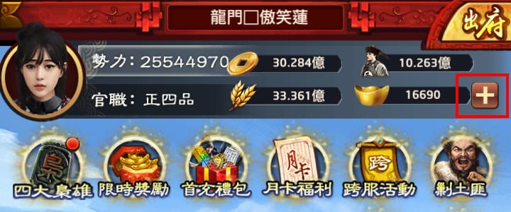 充值時有分「定額充值」,以及「月卡」跟「年卡」。定額充值點「元寶」旁的加號即可充值,這個位置剛好設計放在關閉視窗的位置,有時點太快很容易點到。月卡/年卡則是點「月卡福利」,再挑選要購買月卡還是年卡。