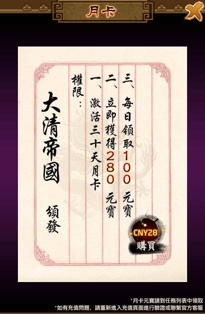 只購買月卡會有一個小問題,「充值獎勵」裡第3檔的獎勵需要花「CNY 30」,而購買月卡只花「CNY 28」,是領不到3檔獎勵的,故至少還得充值「CNY 6」,要不要為了這些獎勵(不同衝榜時期獎勵也不同)多花6人民幣/30台幣,就看個人決策嘍。