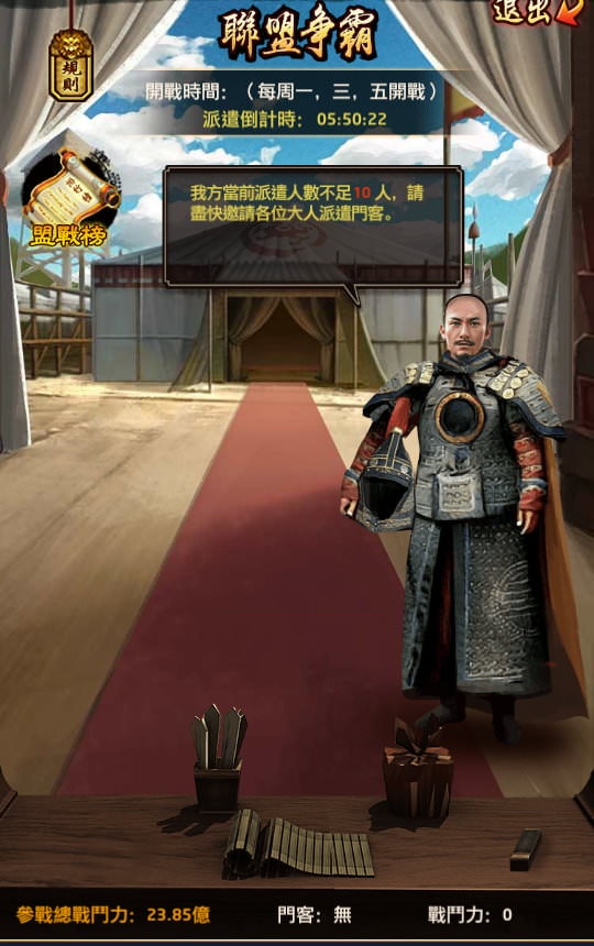 | 3, 聯盟需派遣大於等於10名門客才能參戰。(至少要有10名聯盟成員在備戰日派遣好門客出戰) |