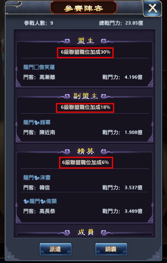 | 2, 聯盟的「等級」,與聯盟成員的「職位」(盟主、副盟主、精英)都能帶來加成。 |
