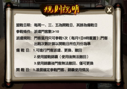 | 1, 派遣的方式為聯盟每名成員都派遣1名門客參戰(若有用伏兵錦囊則可派遣2位),門客參戰後,就無法再參戰下一場,等得下個月才能再度派遣。 |