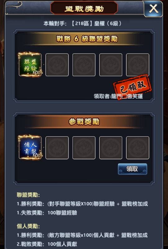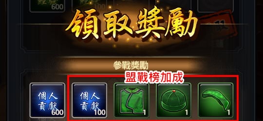 假設對手聯盟6級,那勝利獎勵就是 6 x 100 = 600個人貢獻,另外還有「盟戰榜加成」。
