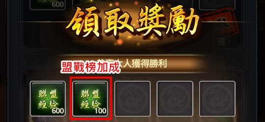 | 勝利 | (對手聯盟等級x100)聯盟經驗+盟戰榜加成 |
