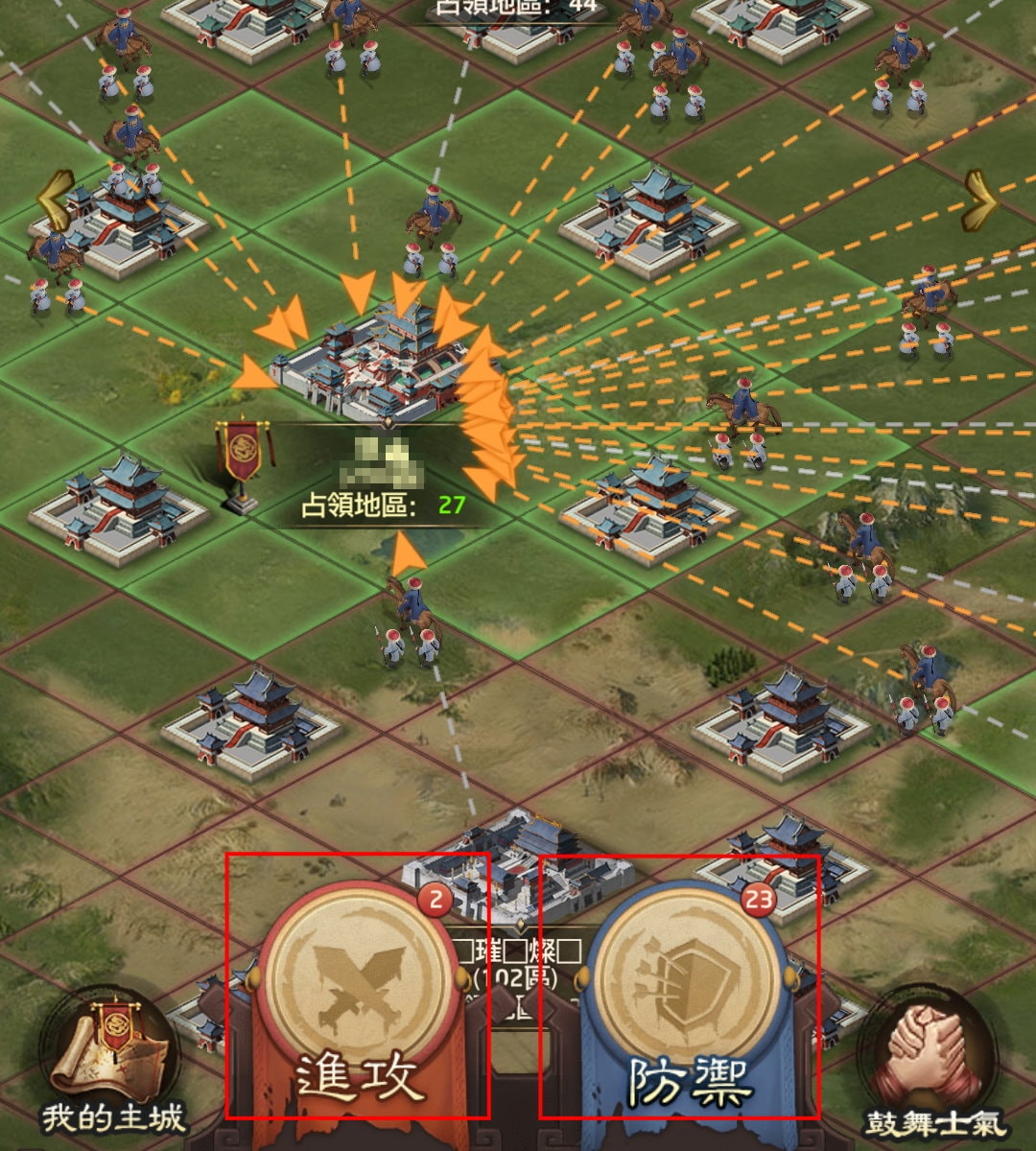首先可以在地圖上看到,箭頭朝向我方城池的,就是進攻我方,需要防禦的。箭頭朝別聯盟城池的,就是我方發動的進攻。也可以從下方的「進攻」與「防禦」兩界面來得知目前的戰事,以及派遣門客參戰。