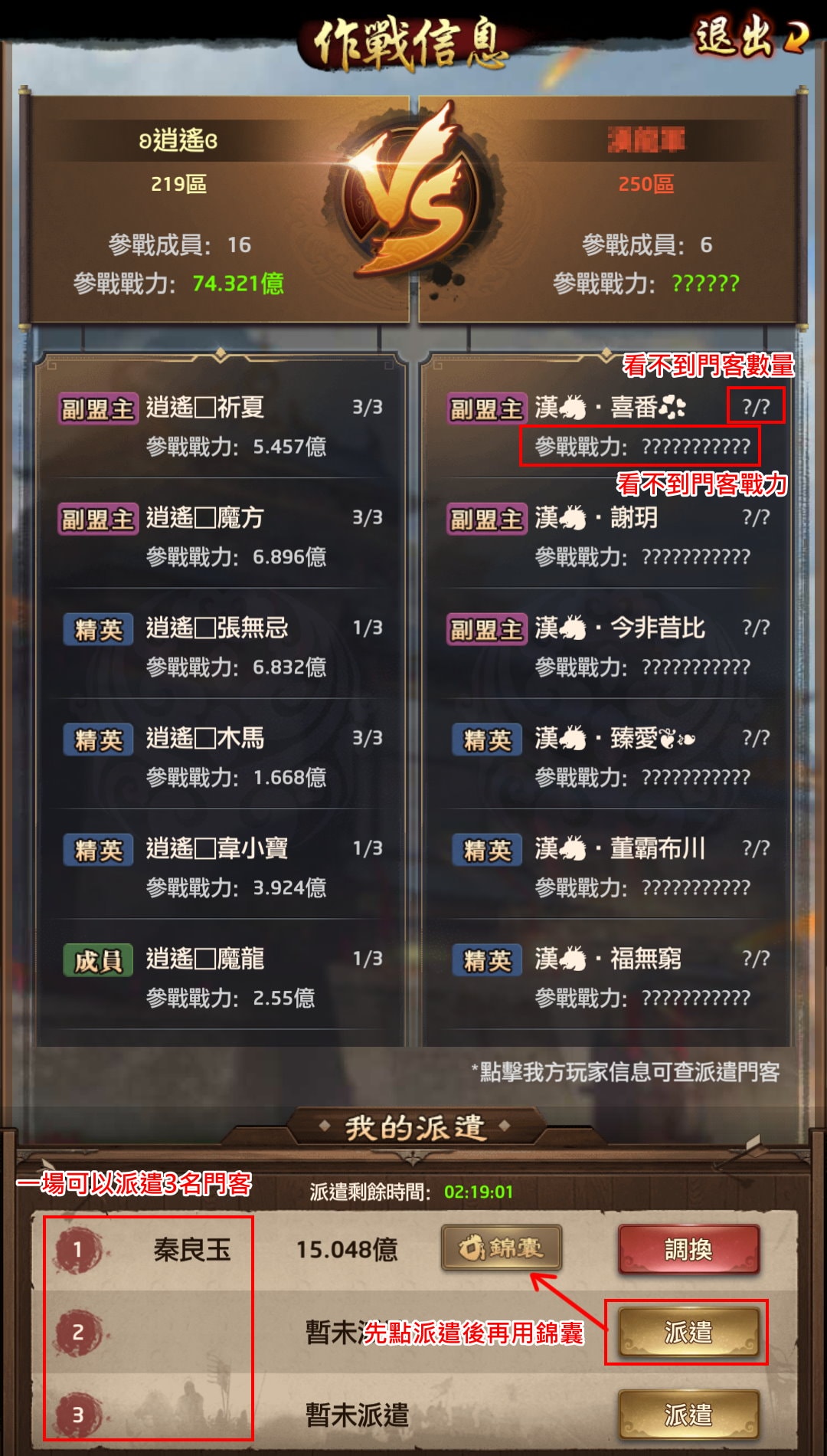派遣門客畫面如上,可以看到對手有多少「成員」參戰,但看不到門客數量(是派遣1名、2名,還是3名門客?),也看不到對手的門客戰力。