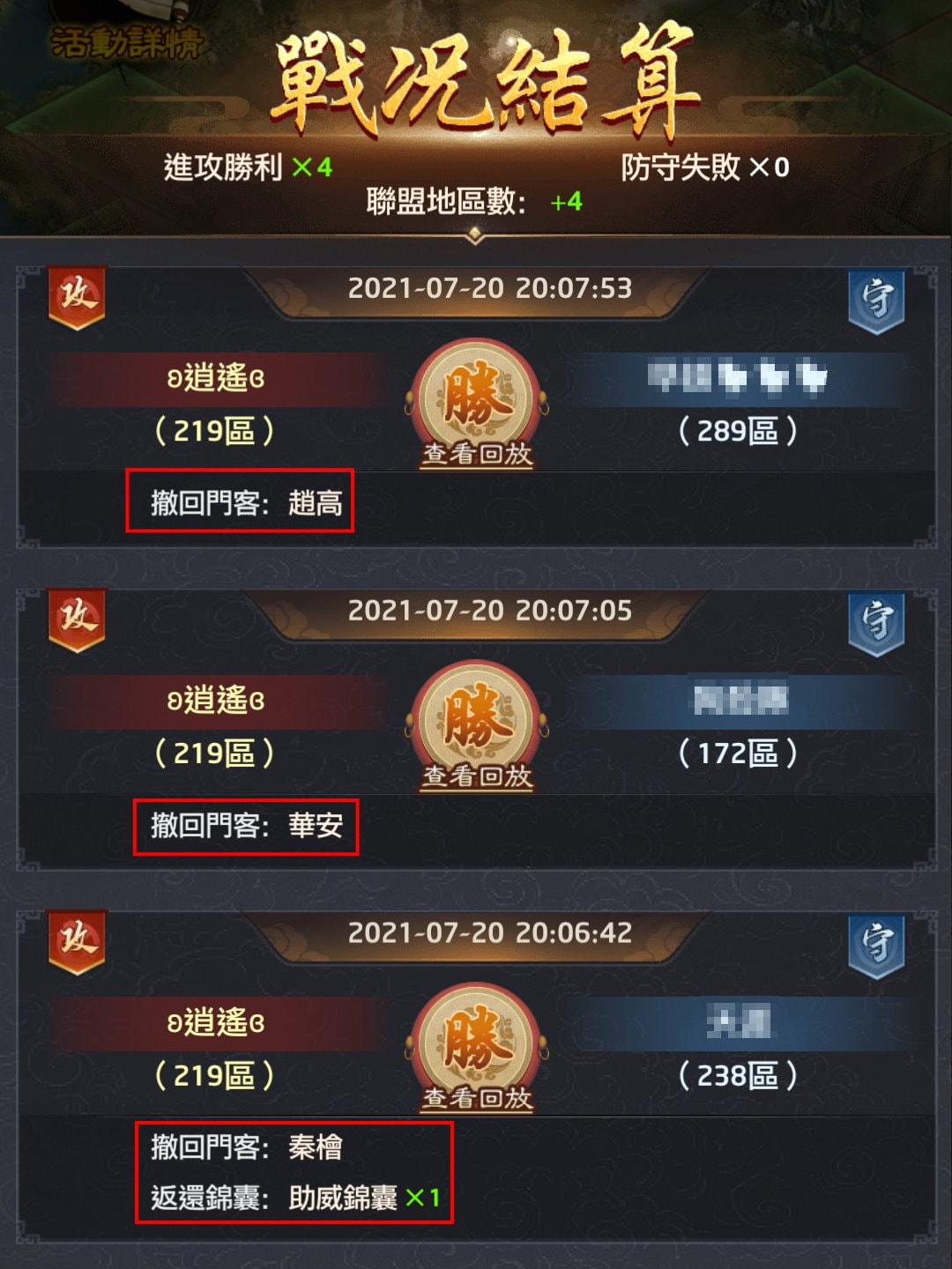 若門客在某場對戰中未上場(前面幾名成員派遣的門客已擊敗對手聯盟所有門客),則「門客」會恢復成可以派遣的狀況,而未使用的「錦囊」也會退回。