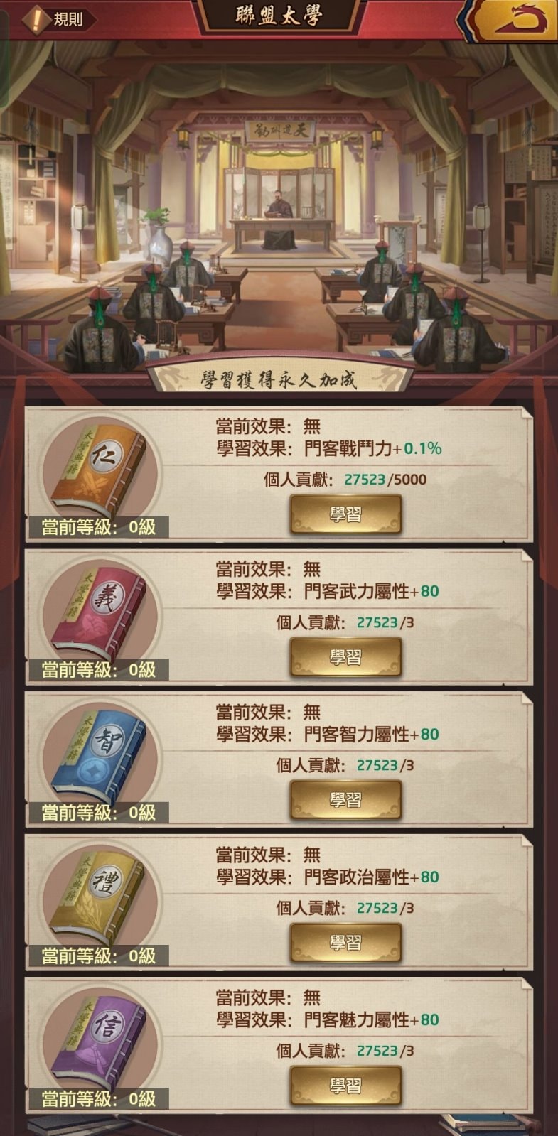 - 大人可消耗個人貢獻在太學內選擇任意典籍進行學習(需達到對應的聯盟等級)。