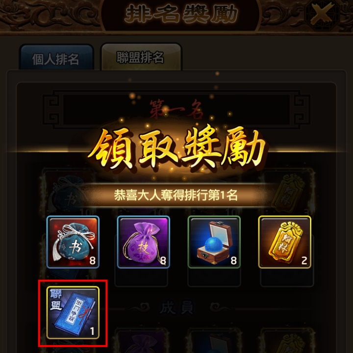 - 福利活動:公堂之上,聯盟排名前3名的聯盟成員