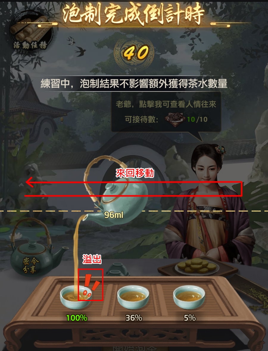 茶壺會在上方左右移動,當移到3個茶杯上方時,點擊茶壺就會開始倒茶,滿100%時要同時停止,不然就會溢出。茶的總量是剛好可以倒滿3個茶杯再多一點點(10ml左右),溢出太多就代表其他茶杯會不夠用。