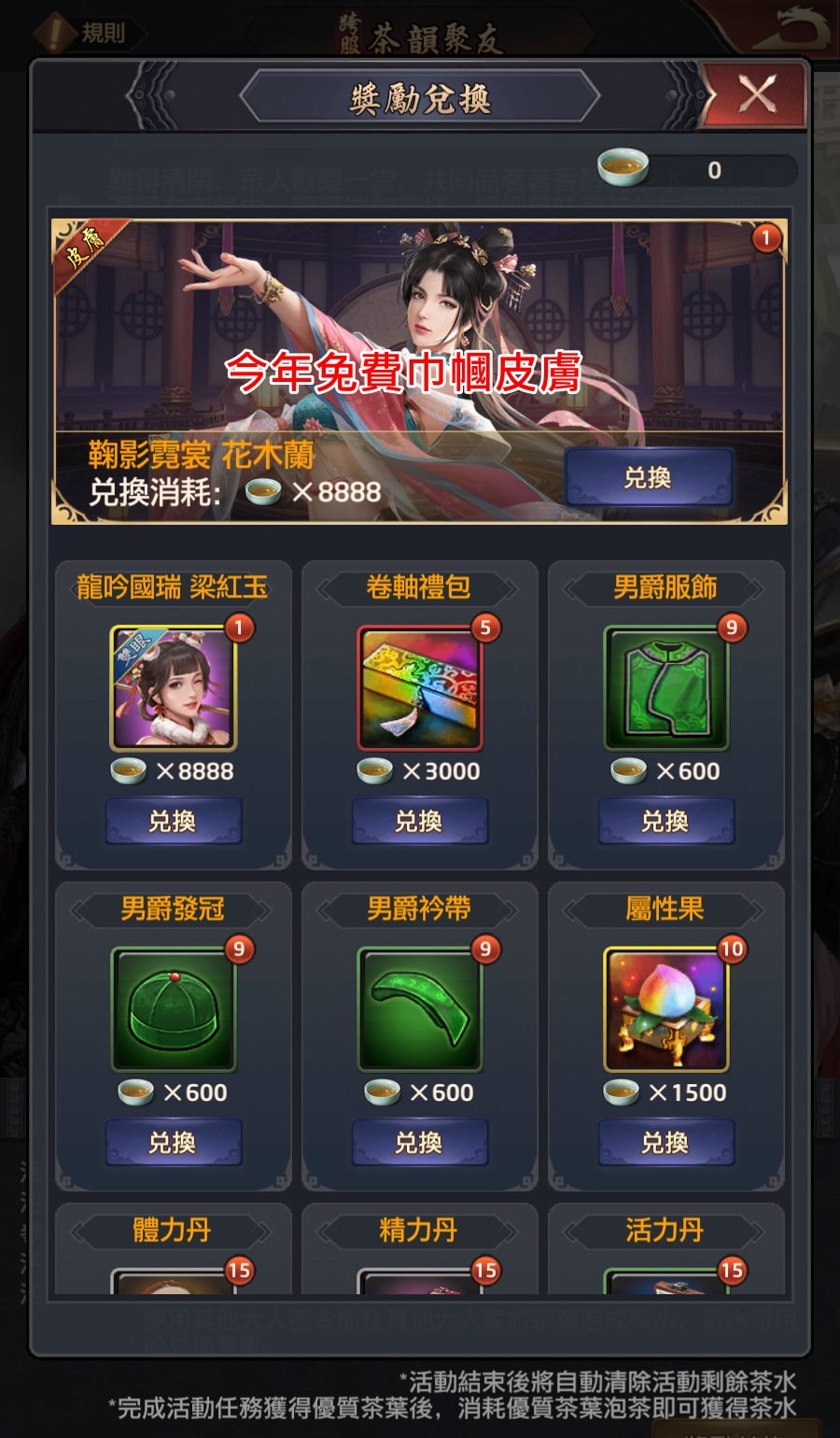 - 活動結束後未使用的【優質茶葉】和【茶水】將自動清除。