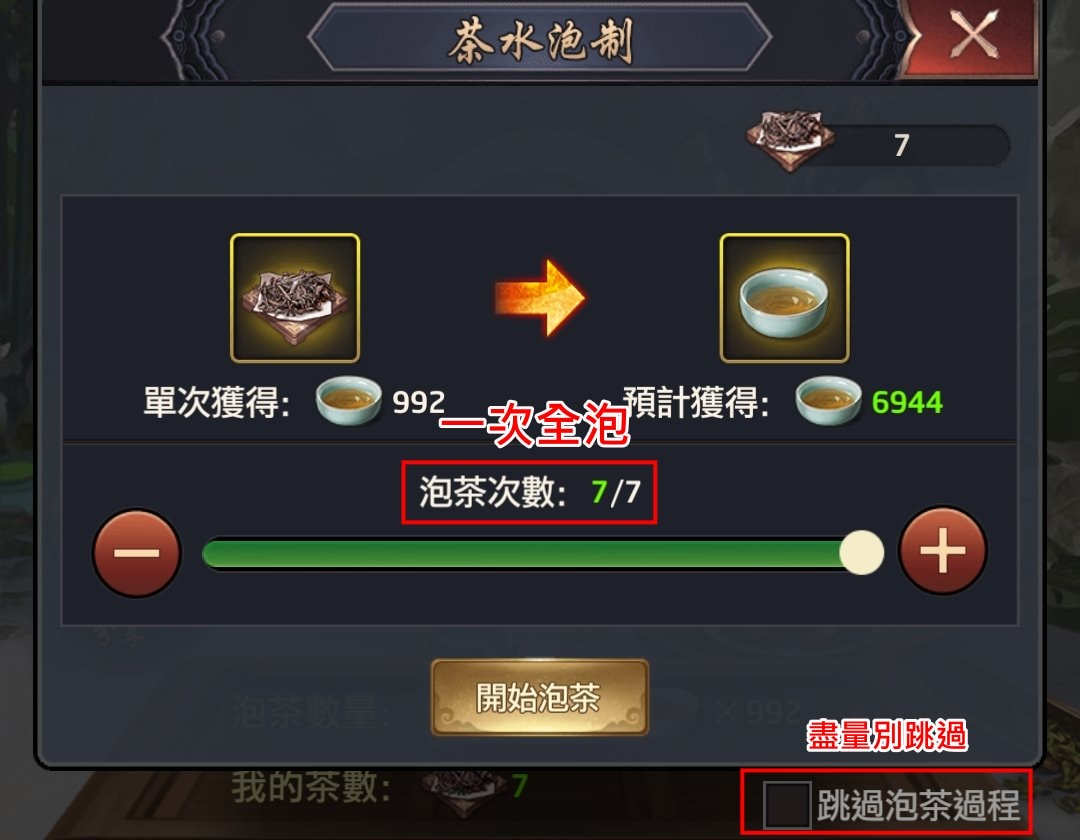- 若懶得遊戲可點「跳過泡茶過程」,但跳過的話會拿不到「額外」的那一份。其實不難也不花時間,建議別勾選跳過。
