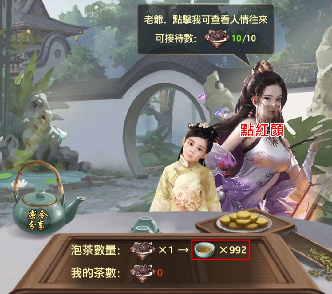 - 大人可選擇在自己主介面或是使用密令拜訪其他大人消耗【優質茶葉】轉換獲得【茶水】。