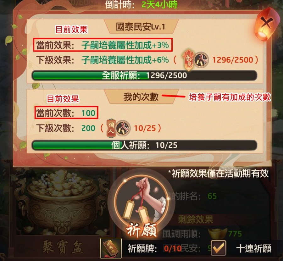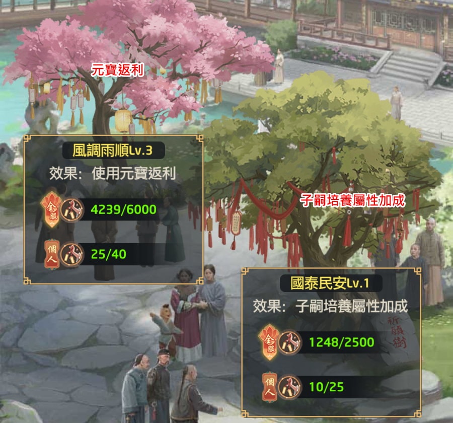 若你一開始就 All In 祈願牌,此時不管是元寶返利、子嗣培養的效果都很低,你是得不到較好報酬的,