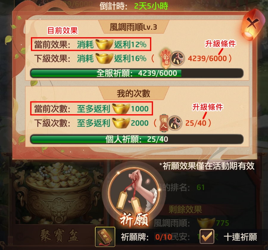 假設我現在祈願25次,我的至多返利是1,000元寶,意思是若返利超過1,000元寶就沒有返利了,除非我在綠樹中祈願達到40次升級,上限就會變成2,000元寶。