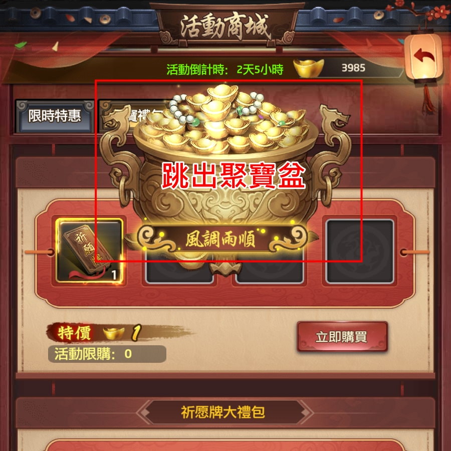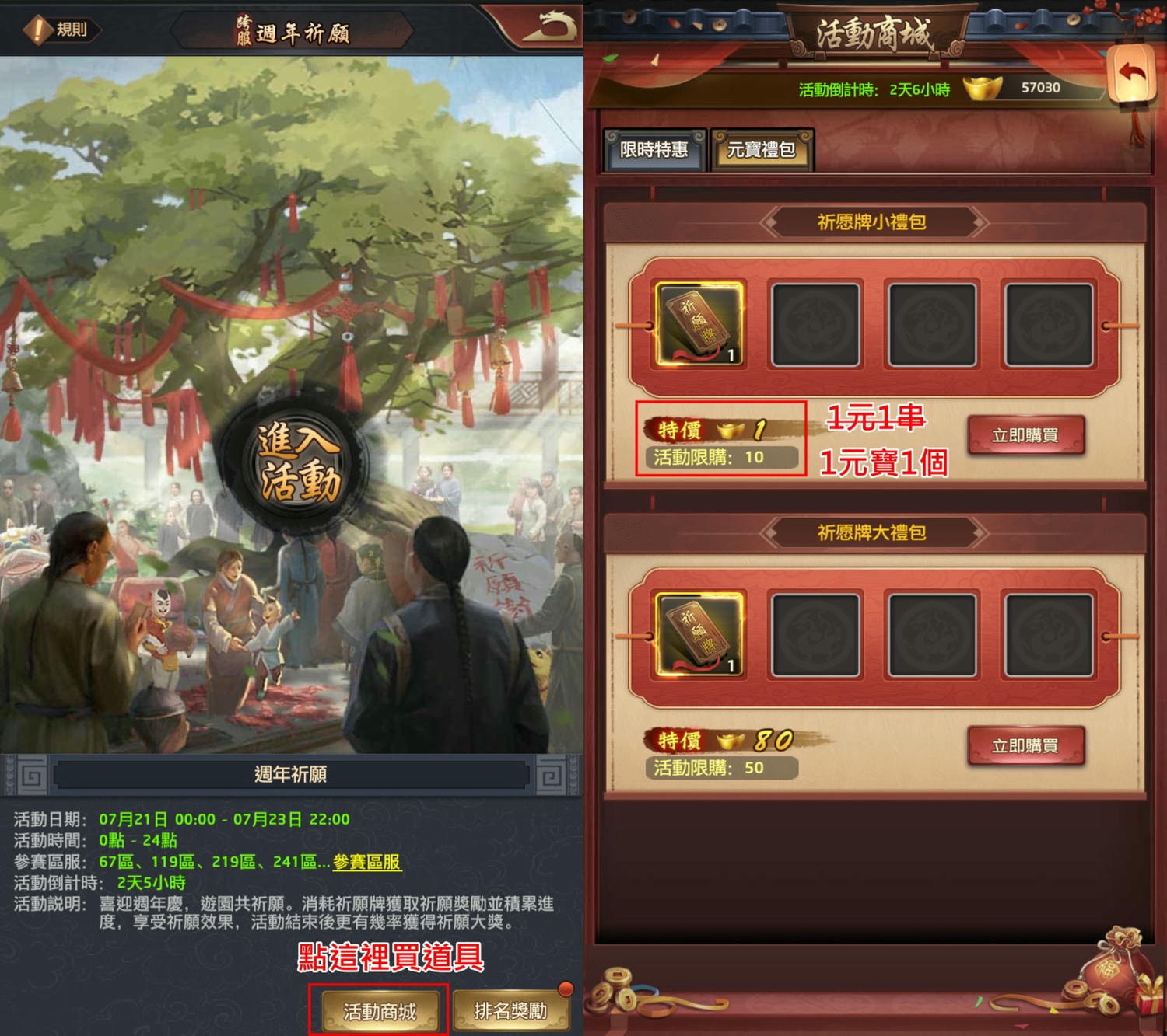 - 不儲值玩家可點介面>活動商城>元寶禮包,用10元寶買10個祈願牌,挑棵樹祈願10次。