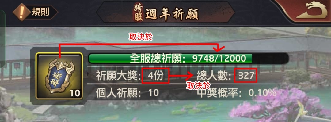 取決於10個區服的玩家,總共有多少玩家登入帳號去祈願1次以上。從201人開始獎勵會變成3份、301人變4份,依此類推。