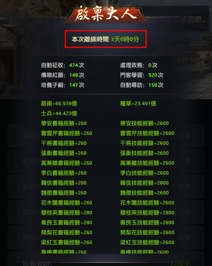 前面有說到遊戲並不是透過點擊這個動作才把離線時的收益給你,在玩家離線時就開始工作並計算收益。但是要注意到:若超過3天(72小時)沒去點自動師爺,它就會暫停工作。