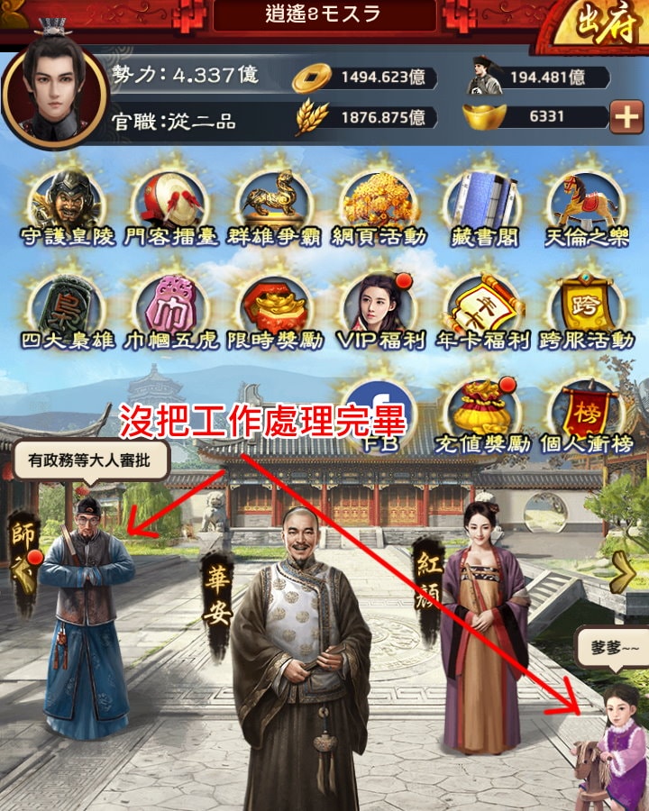 偶爾還會遇到一種情況,自動師爺不是完全罷工,而是沒把所有事情處理完畢,剛進遊戲時就發現政務還有1次沒處理、傳喚還有1次沒傳喚,或是部份子嗣還有培養次數沒完成。