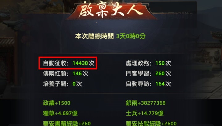 我用一個方法測試過自動師爺的啟動條件與工作狀況,我的帳號A是壓智狀態,每分鐘可收成一次,在我離線後,趕緊換個帳號B去「限時獎勵 > 累計招募士兵次數 > 玩家進度」查看,發現才剛登出1分鐘,帳號A招兵次數每分鐘都會+1,意思就是: