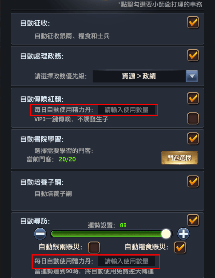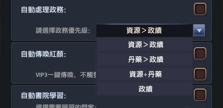 | (b)(c) 自動處理政務 | 很多玩家都說遊戲初期要優先選屬性丹丸散,其次才是政績。我個人初期只選屬性「丹」,丸、散都不要,原因是門客100級時,1資質才加 1019.8屬性,1顆丹就有1000屬性。後期我會加選「士兵」,原因是這遊戲很缺兵,而且若靠經營資產賺兵,得耗費1次糧+1次兵才能徵到兵,直接從政績這邊選兵,跟選錢或選糧比起來等於是2倍的價值。這個選項我也不會打勾。 |