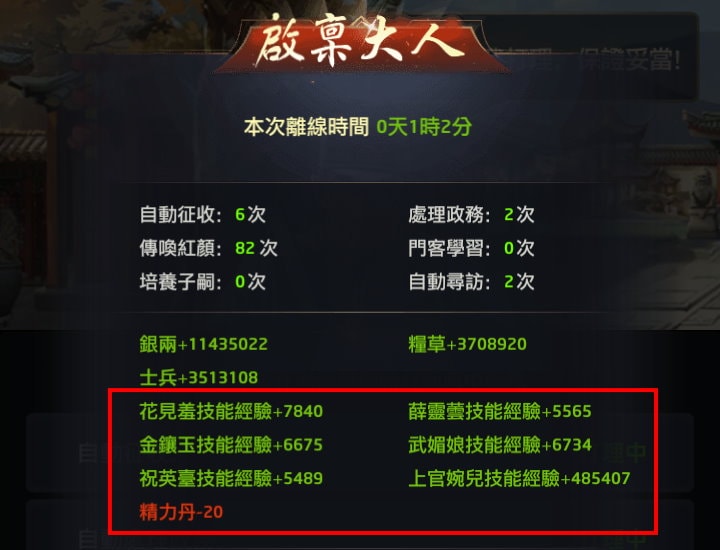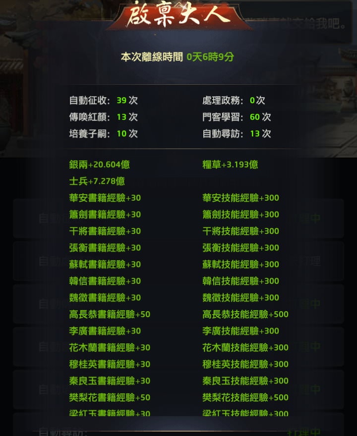 自動師爺會在你離線後工作,當你再度登入遊戲後,點左下角的自動師爺時,會秀出這段時間的收益。
