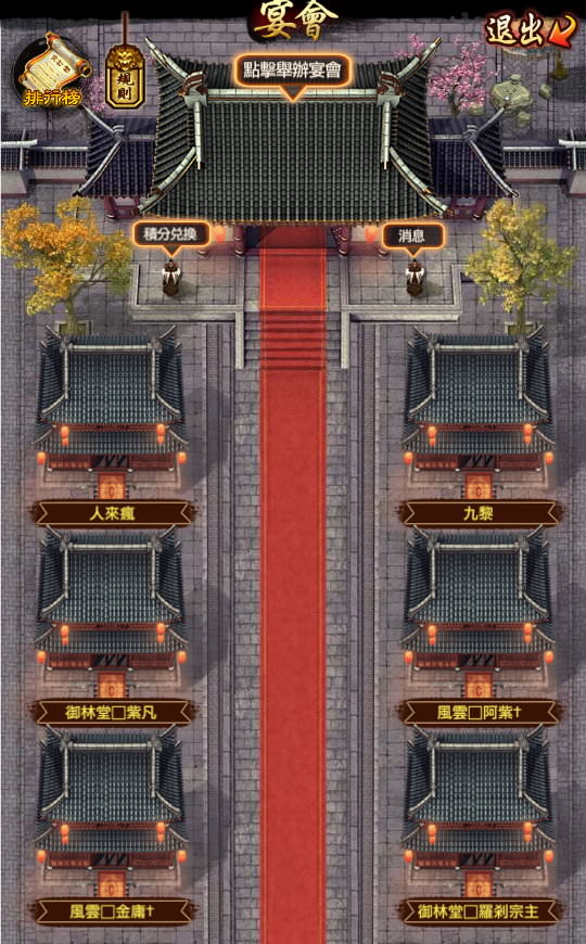 點進「酒樓」後,若有人開宴會就會看到建築物,大的是官宴,小的是家宴,而藍色字體的則是同個「聯盟」盟友開的,這遊戲許多地方(如翰林院)盟友都會以藍色字體來顯示。