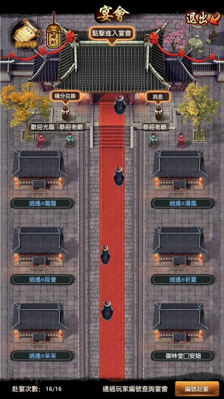 酒樓右下角有個「編號赴宴」功能,輸入對方「編號」,點「查詢」,再點「前往」,就能赴宴。這主要有兩個作用:
