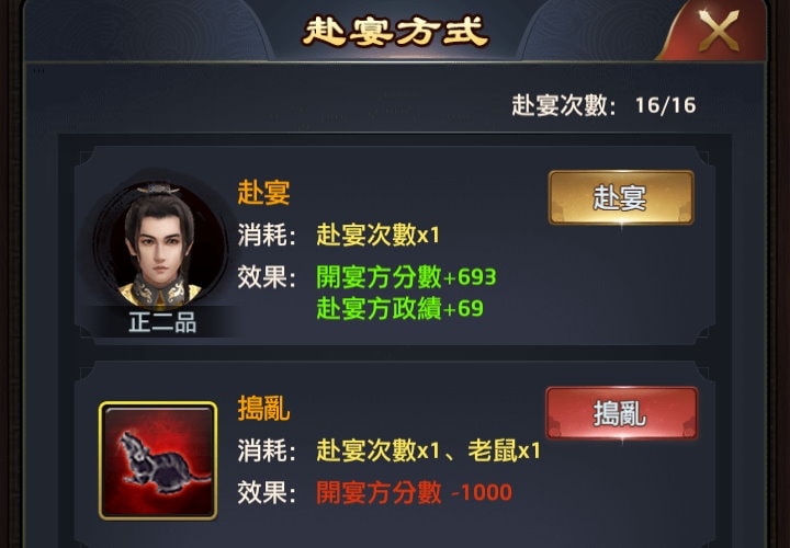 - 選「赴宴」時,對方會獲得「宴會分數」(宴會積分),我方則獲得「政績」。