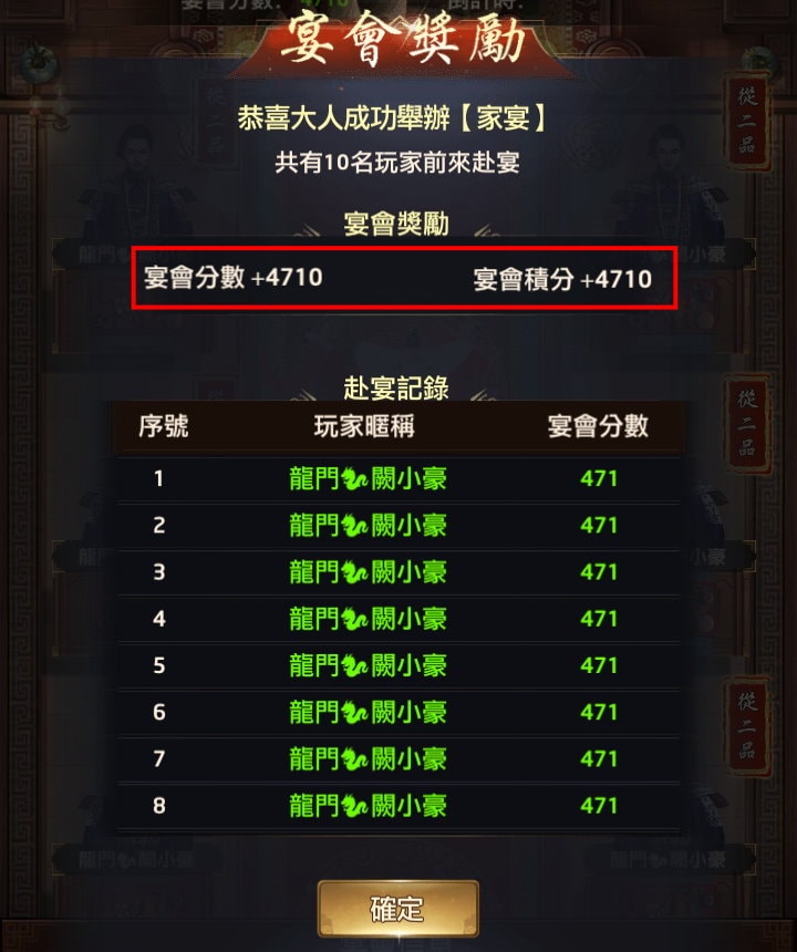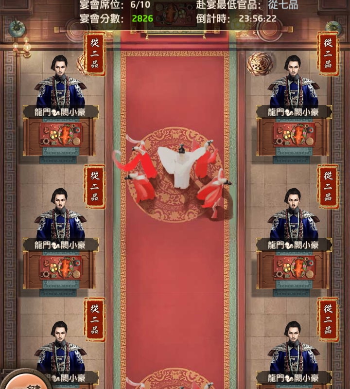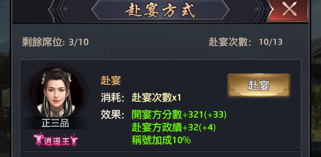如正三品赴宴一次宴會分數+321,赴宴者就能獲得 32 政績。
