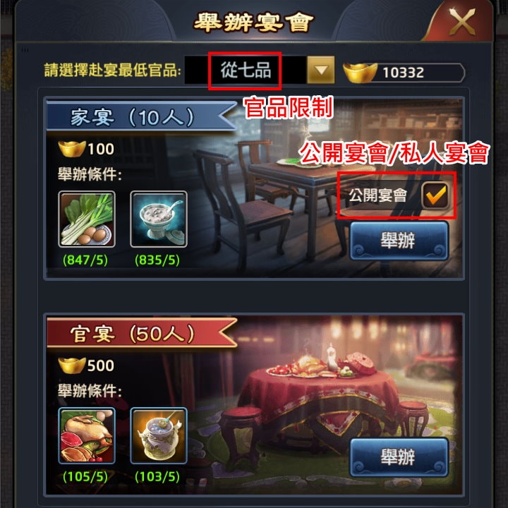 改版後,開宴時能限制「官品」多少以上的玩家才能來吃。