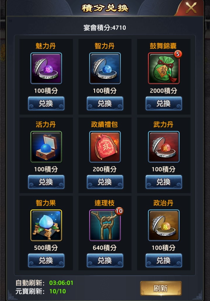 一開始沒充值玩家都是靠吃宴賺分數,分數相當有限,兌換時得在「政績」跟「勢力」(門客資質)之間選一個,個人會建議選「政績」,先兌換「政績禮包」,早期每天多個50政績會很有用。當有能力開宴,加上盟友門客屬性越來越高,分數就足以每天換1個政績禮包+1個卷軸殘卷,或更多。