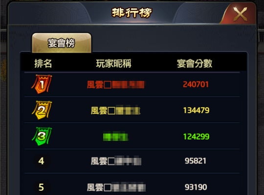 排行榜則是開服到現在,所有玩家在宴會分數的排行。