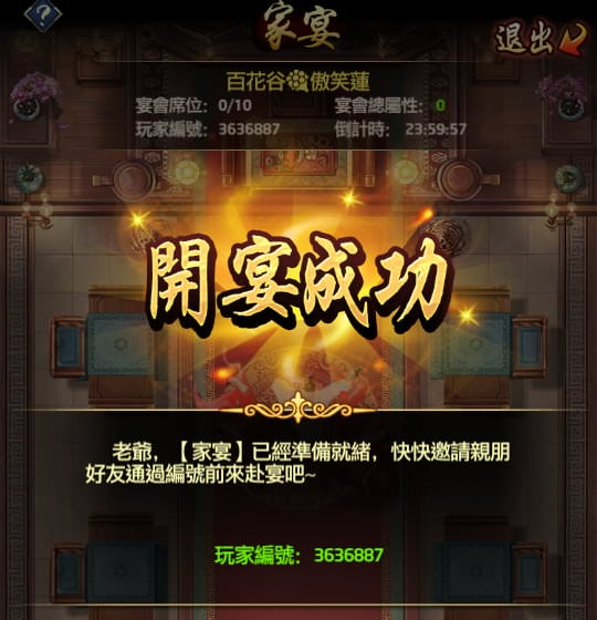 技巧:酒樓不像「翰林院」畫面可以往下拉,最多就只會顯示6場宴會,若你開宴會後沒有顯示在畫面上,就得到盟頻請盟友用(你的)「編號」幫忙吃宴。(宴會若會滿,丟公頻作用也不大)