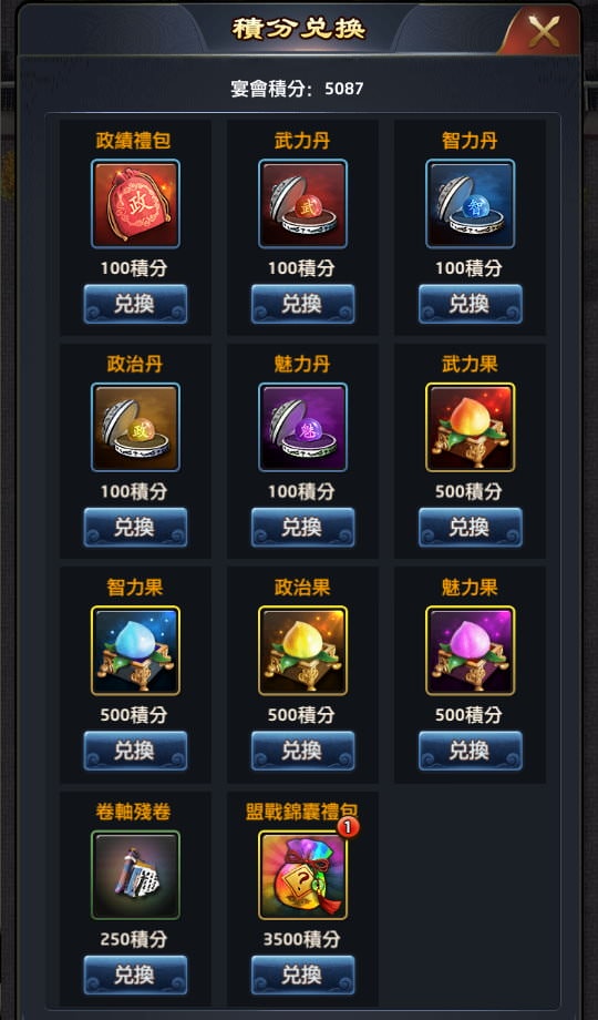 | 數量/積分 | 政績禮包/武力丹/智力丹/政治丹/魅力丹 | 武力果/智力果/政治果/魅力果 | 卷軸殘卷 | 盟戰錦囊禮包 |