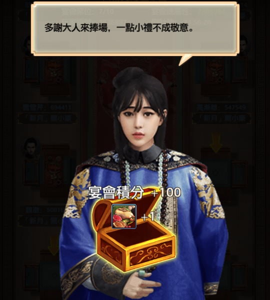 每位門客參加宴會都能得到 100 宴會積分,還有機率拿到開宴會的食材。
