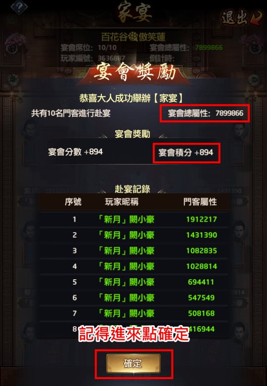 1, 宴會門客坐滿後,要進來點「確定」,宴會分數才會增加。在「宴會衝榜」期間,如果你開私宴桌給盟友吃,開完就放著不管,那這些分數是不會算到宴會衝榜裡頭的。