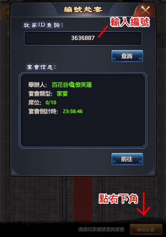 | 2, 若是其他盟玩家開的私宴,就必須點右下角的「編號赴宴」,輸入對方「編號」,點「查詢」,再點「前往」,才能赴宴。 |