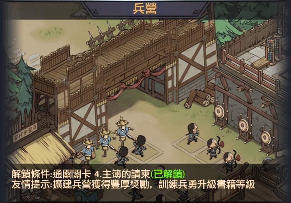 | 軍營等級 | 單次徵募人數 | 每日兵勇收益 | 擴建費用(單項目)(軍餉) | 擴建獎勵 | 升下級最少要花費時間 |
