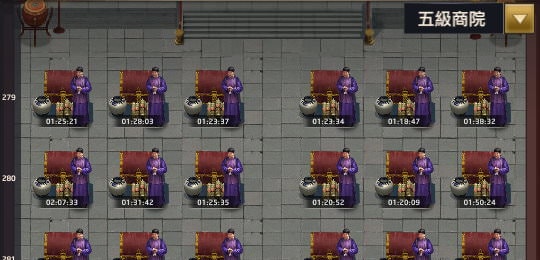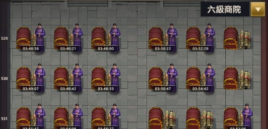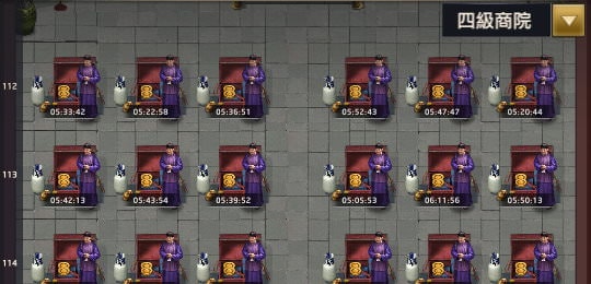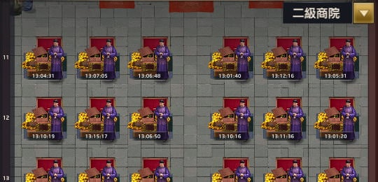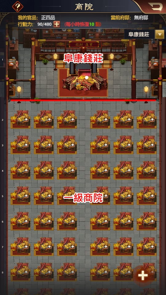 京城商院的界面,操作原理跟府邸一樣,佔據位置後獲得報酬。最上面也有個位置「阜康錢莊」(第1列),只有1個位置,下方是「一級商院」(第2~10列),共50桌。