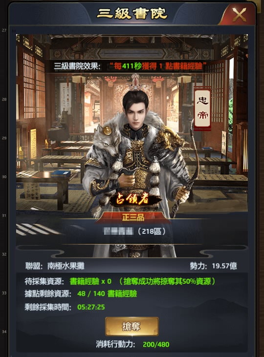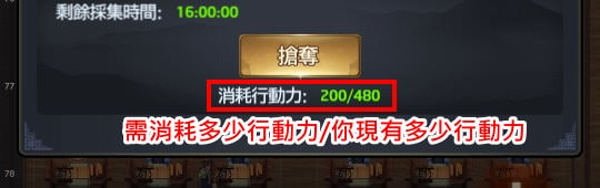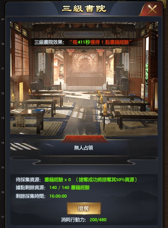 搶奪需要花費「行動力」,像「三級書院」需消耗200行動力。