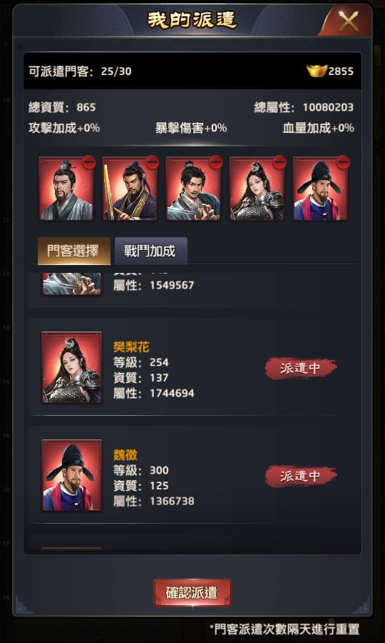 附註:每個門客每天可派遣1次,凌晨12點重置。
